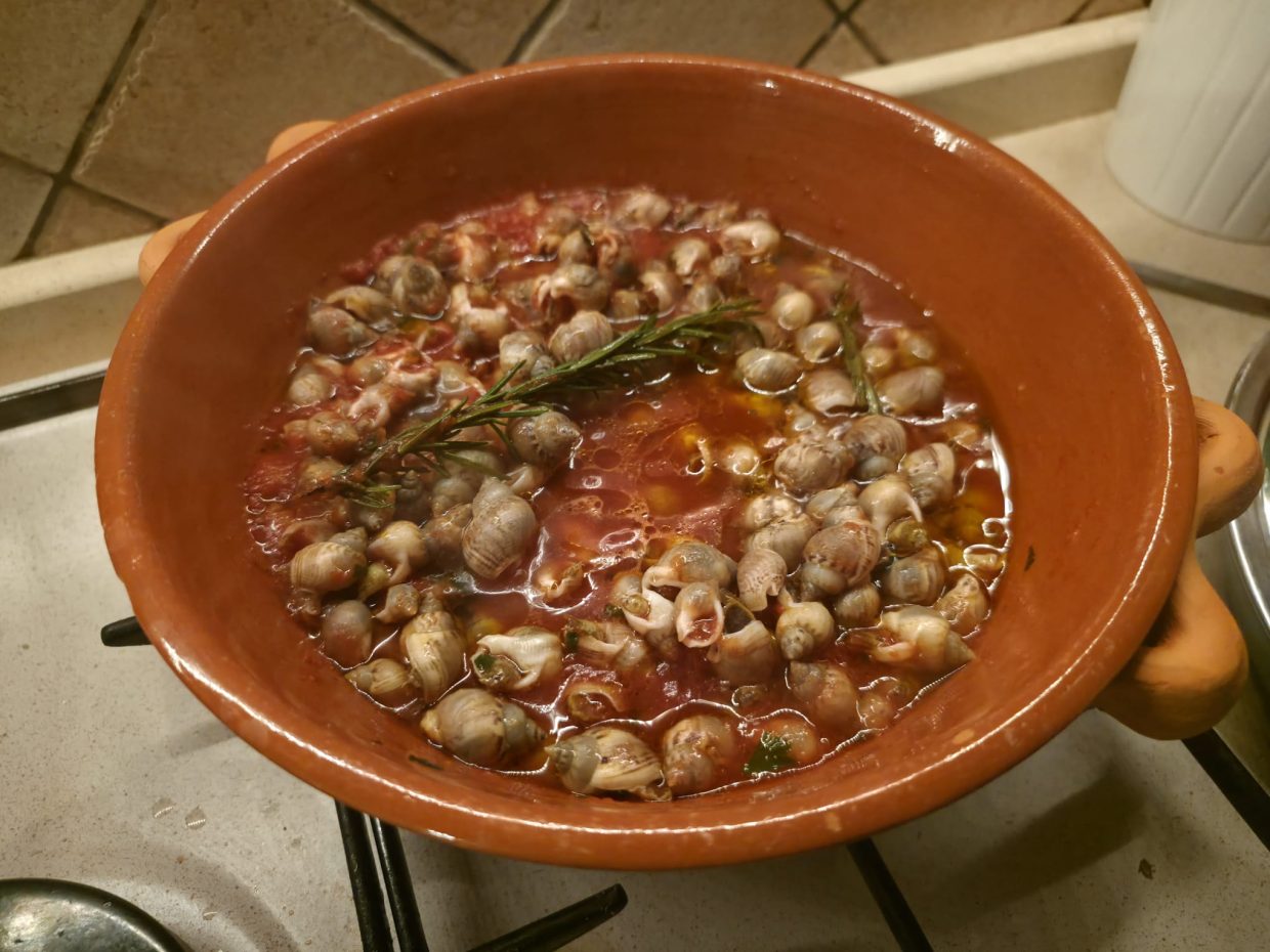 La padella di terracotta è fondamentale per mantenere il calore e insaporire il sugo. È una specialità tipica della tradizione abruzzese. La pre-bollitura aiuta a pulire bene le lumachine prima di aggiungerle al sugo.